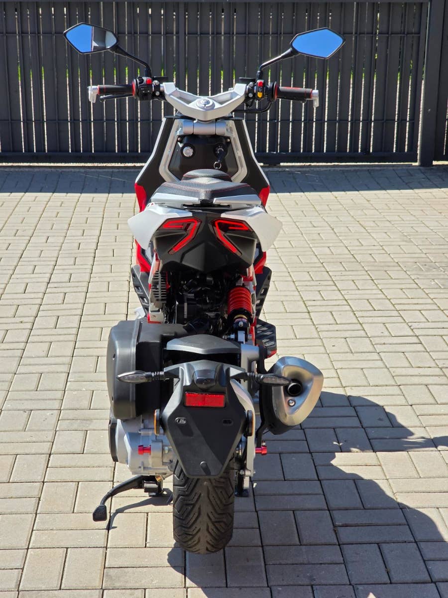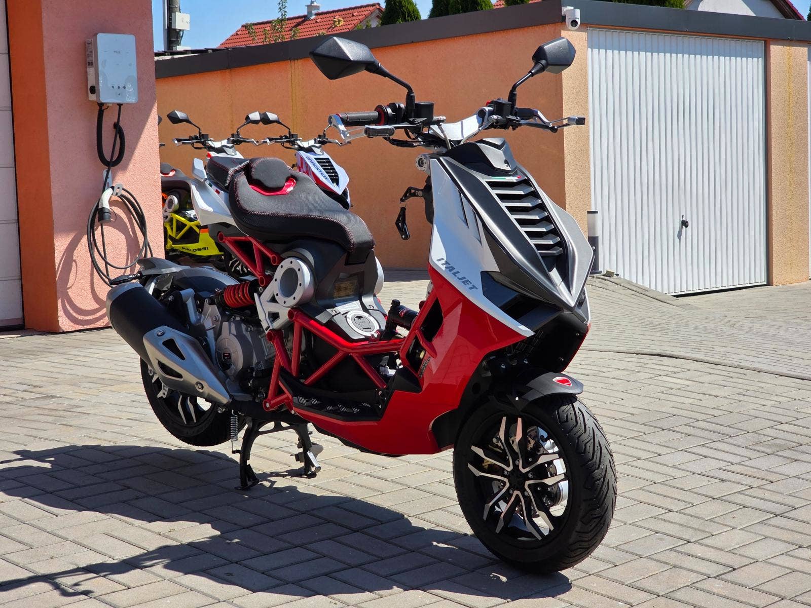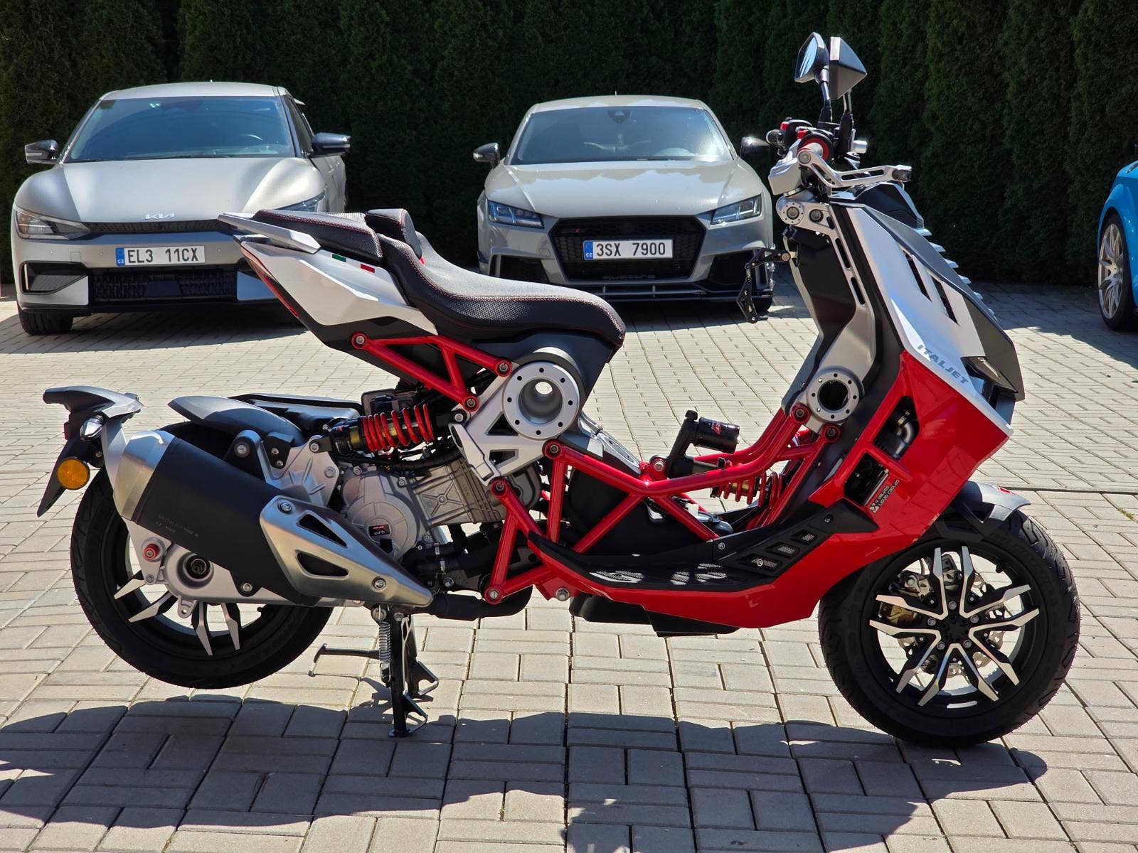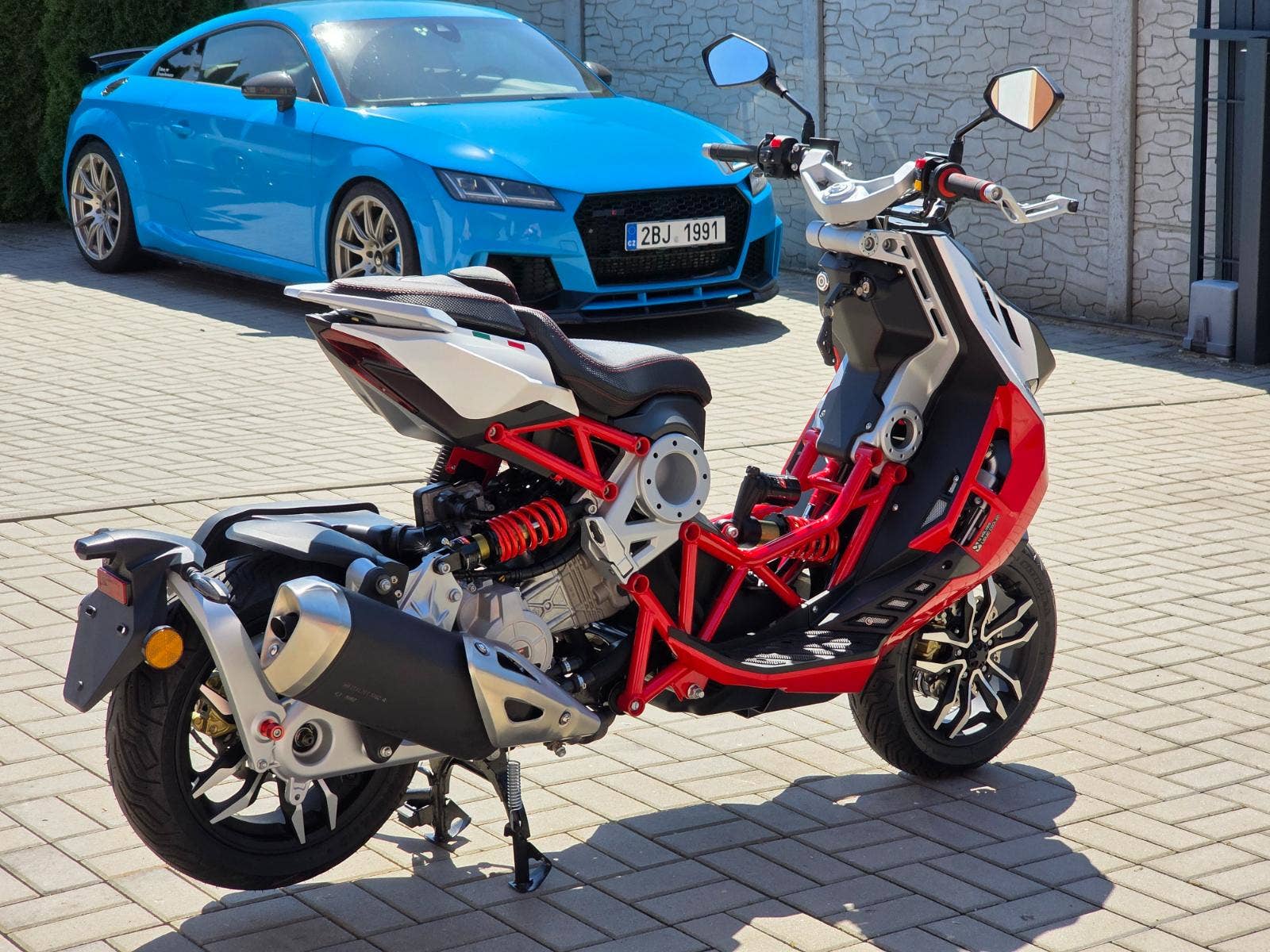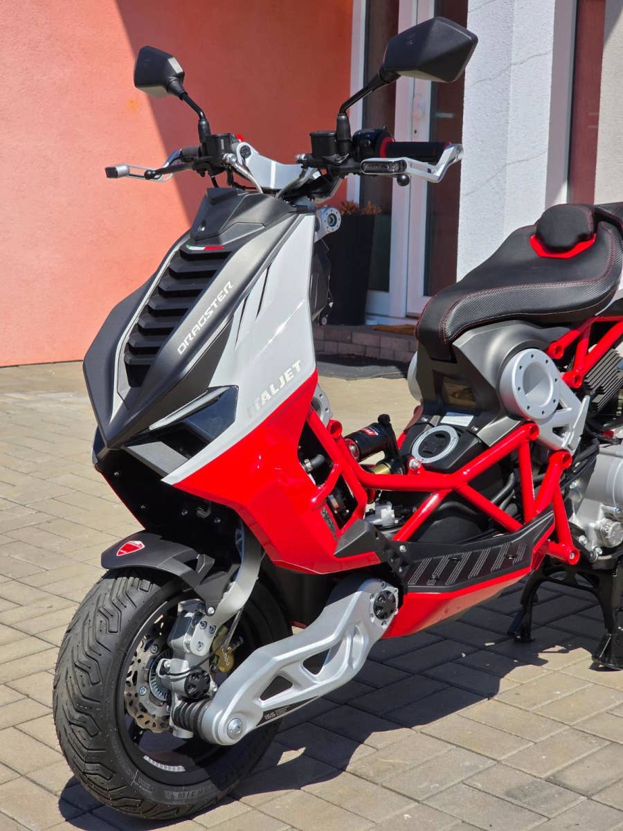 Prodám tento ikonický italský skútr Italjet Dragster 125 v červeno-bílo antracitové barvě, rok výroby 2025, najeto 14 km, výkon 9,2 kW (12,5koní), objem motoru 125cm3, STK platná do 7/2031, suchá hmotnost pouze 124kg. Možnost řídit s ŘP skupiny B (na auto) nebo A1. Oficiální tovární záruka. Jedná se o naprosto unikátní stylový supersportovní skútr, se kterým rozhodně budete středem pozornosti a užijete si sportovní jízdu díky prémiovým komponentům. Trubkový příhradový rám z molybdenové oceli společně s tlakově litými hliníkovými pláty, I. S. S Independent Steering System (přední jednostranné zavěšení s kyvnou vidlicí a řízením rejdovým čepem), Brzdy Brembo, tlumiče Bitubo, vysoce výkonné motory 125 a 300cm3 DOHC Euro 5 navržené v Itálii, full LED osvětlení a naprosto jedinečný design.