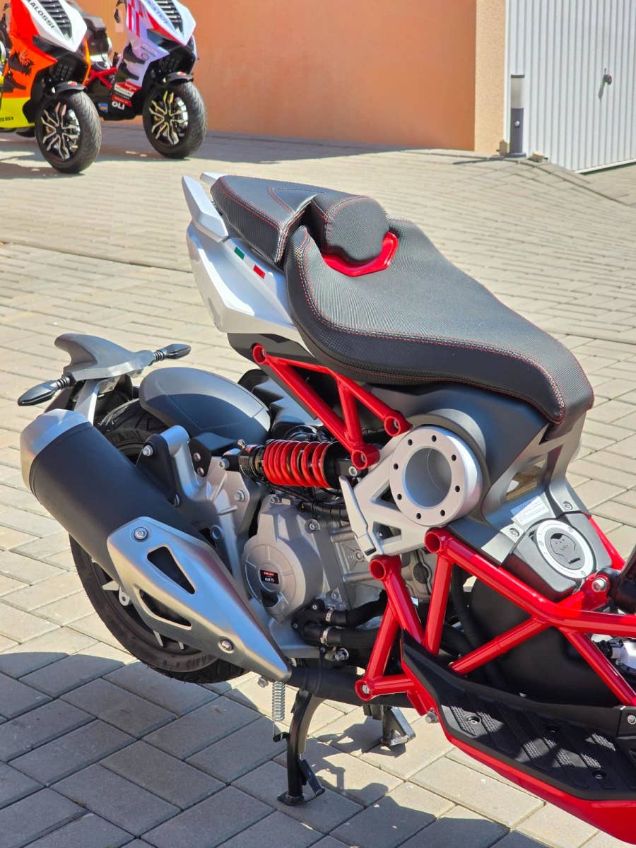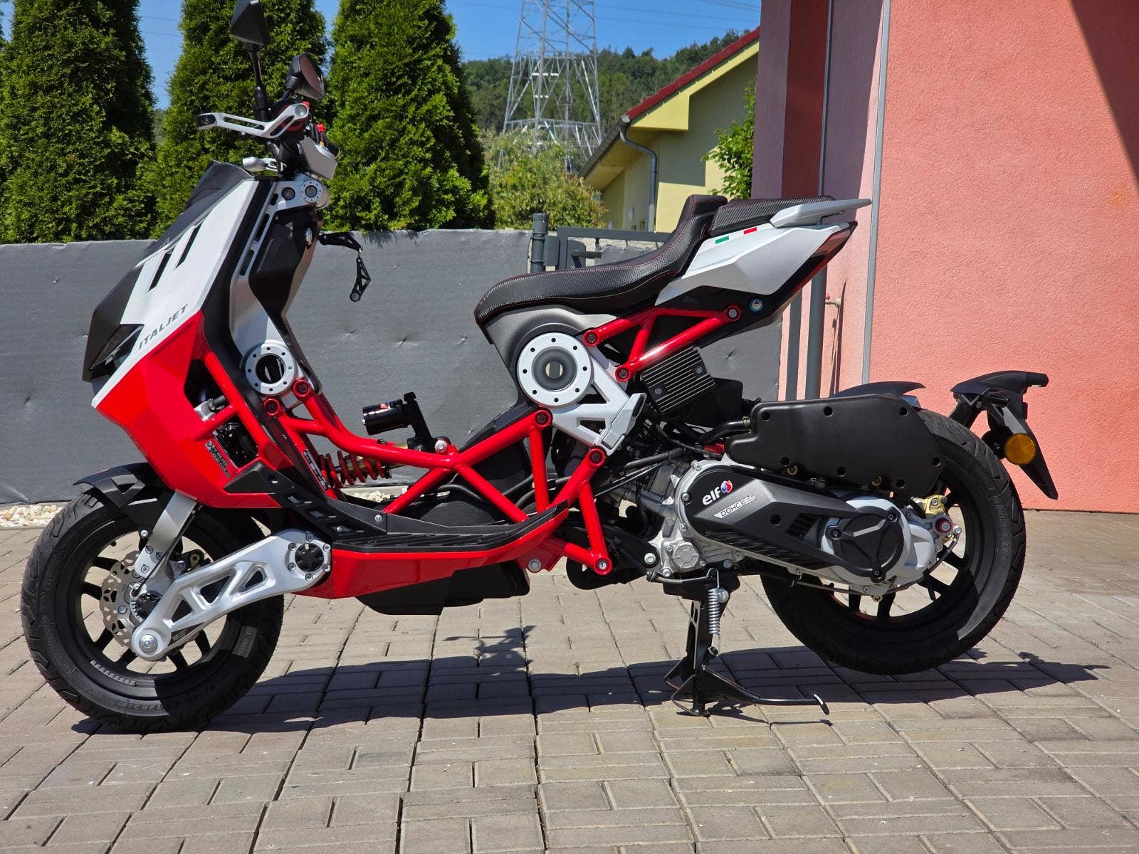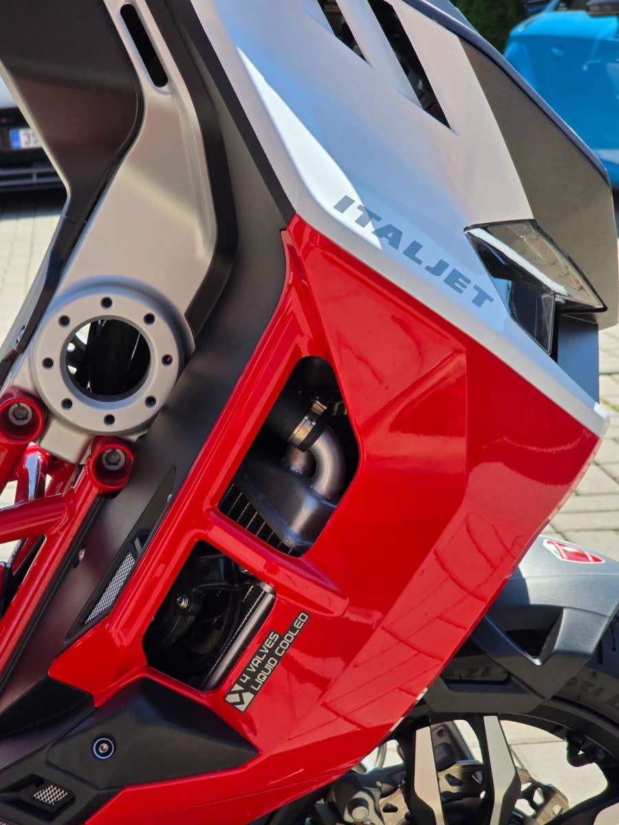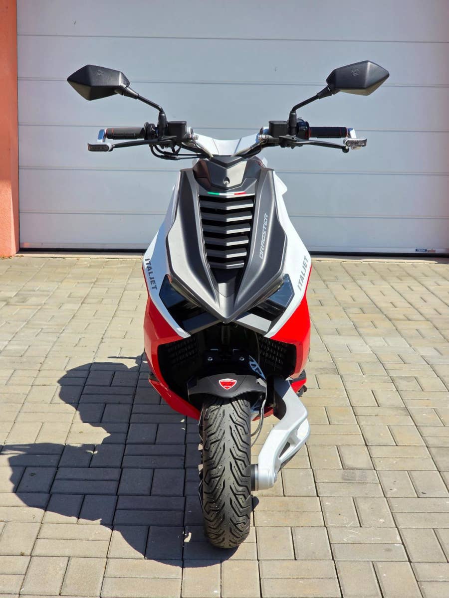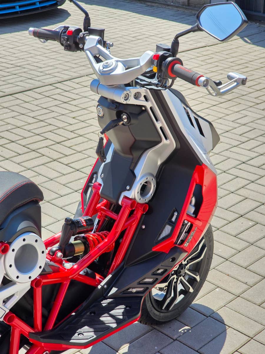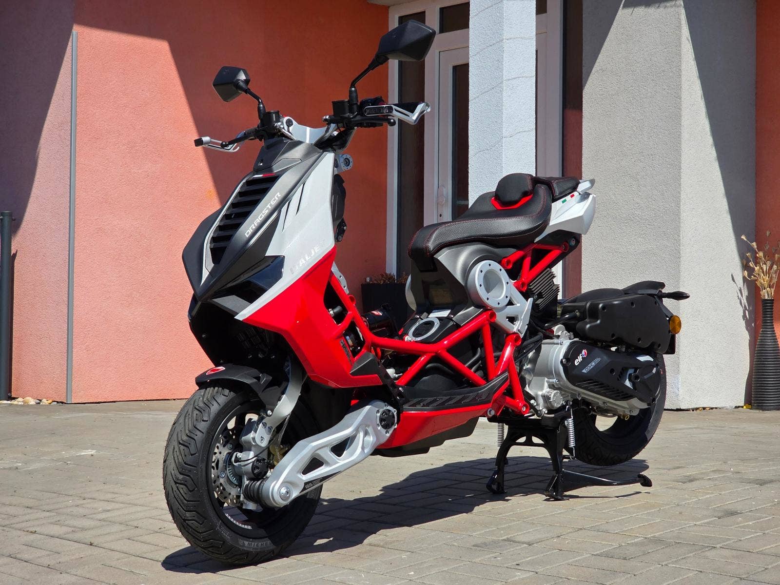 Prodám tento ikonický italský skútr Italjet Dragster 125 v červeno-bílo antracitové barvě, rok výroby 2025, najeto 14 km, výkon 9,2 kW (12,5koní), objem motoru 125cm3, STK platná do 7/2031, suchá hmotnost pouze 124kg. Možnost řídit s ŘP skupiny B (na auto) nebo A1. Oficiální tovární záruka. Jedná se o naprosto unikátní stylový supersportovní skútr, se kterým rozhodně budete středem pozornosti a užijete si sportovní jízdu díky prémiovým komponentům. Trubkový příhradový rám z molybdenové oceli společně s tlakově litými hliníkovými pláty, I. S. S Independent Steering System (přední jednostranné zavěšení s kyvnou vidlicí a řízením rejdovým čepem), Brzdy Brembo, tlumiče Bitubo, vysoce výkonné motory 125 a 300cm3 DOHC Euro 5 navržené v Itálii, full LED osvětlení a naprosto jedinečný design.