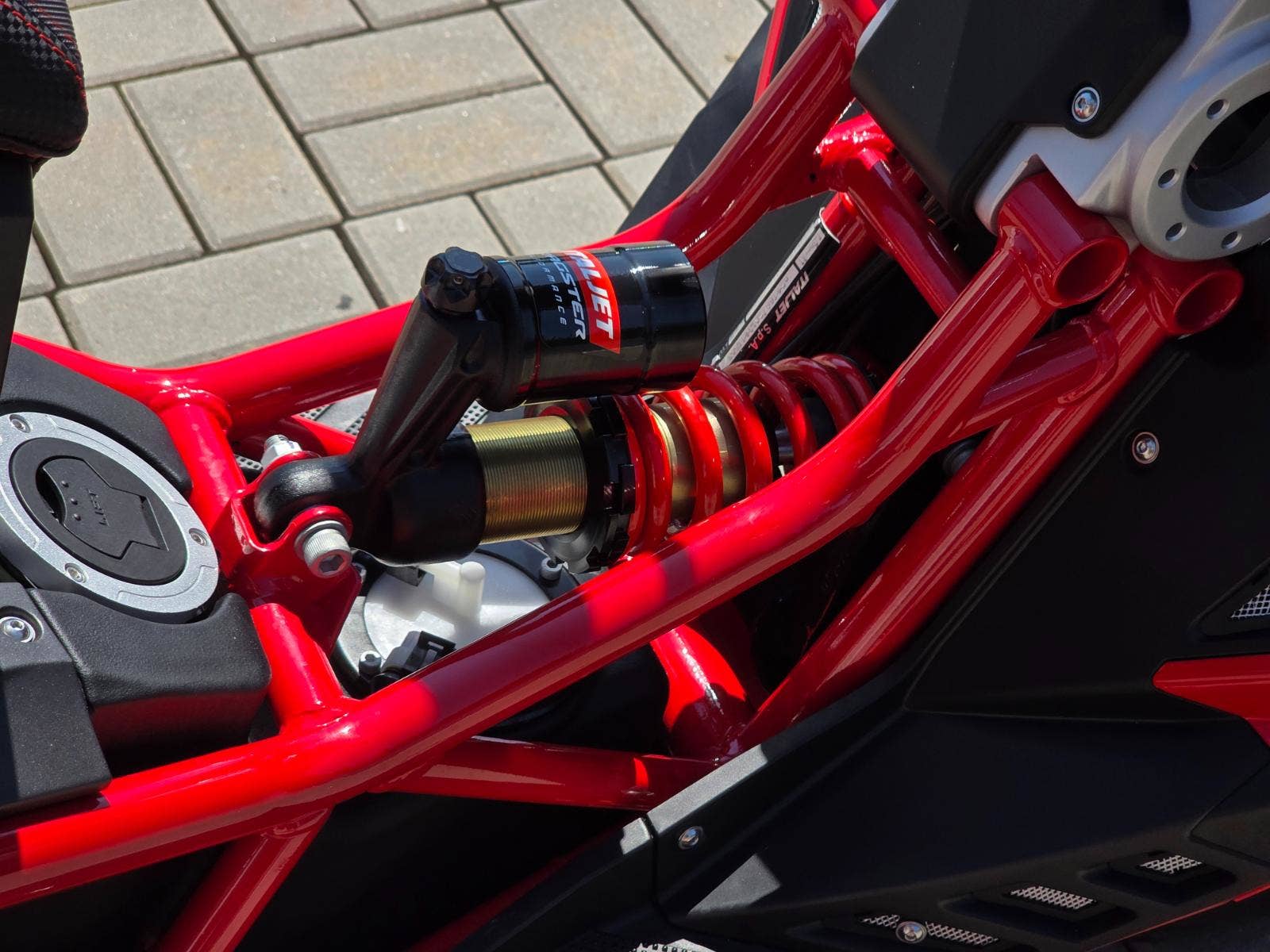 Podvozek: přední zavěšení jednoramenný tlumič ISS a hydropneumatický nastavitelný tlumič Bitubo, zadní zavěšení jeden hydropneumatický nastavitelný tlumič Bitubo