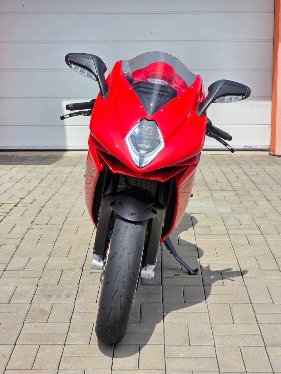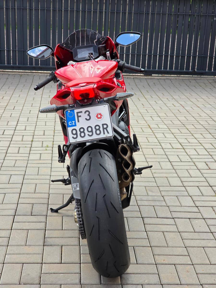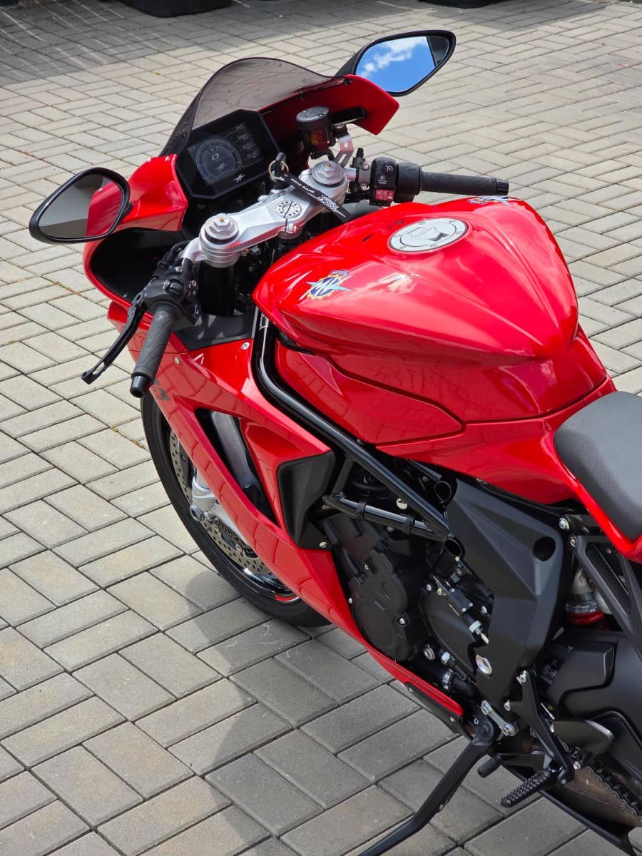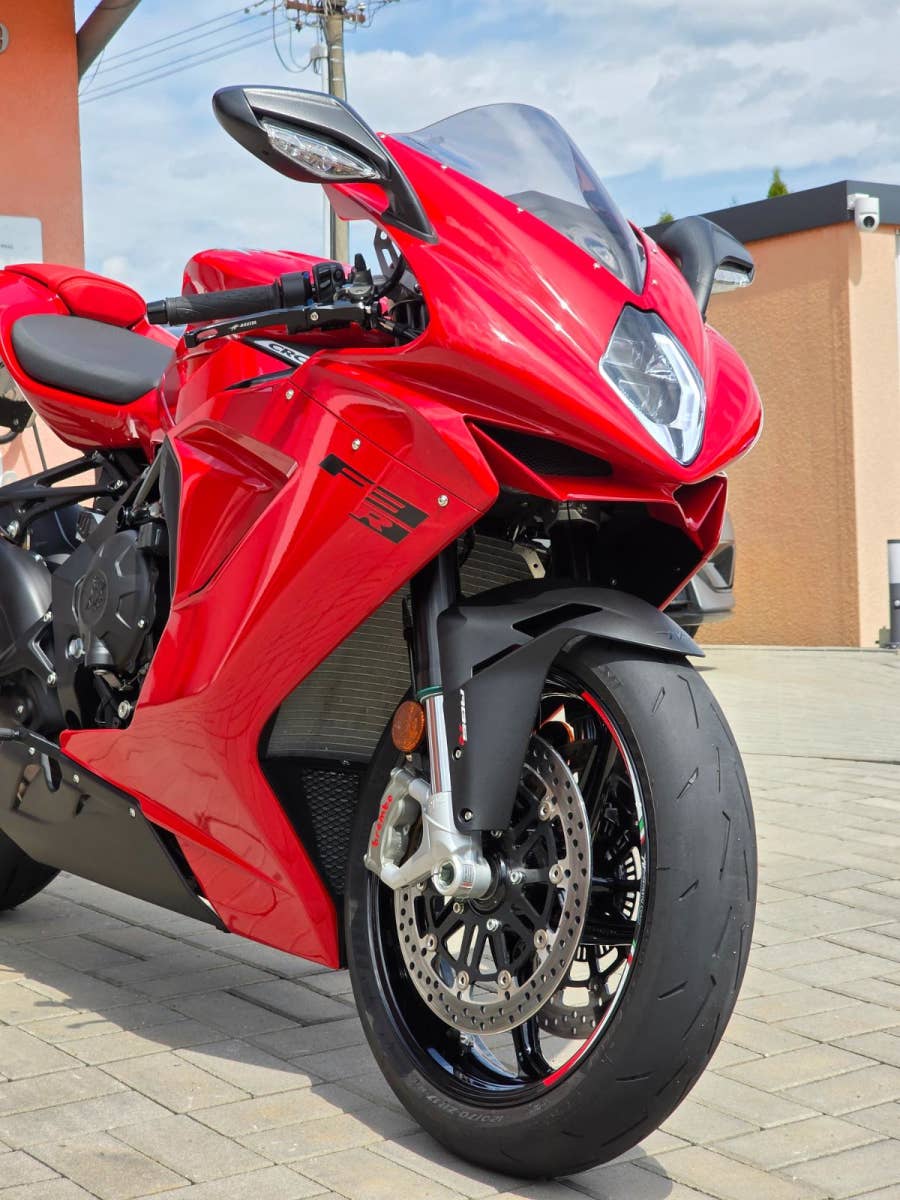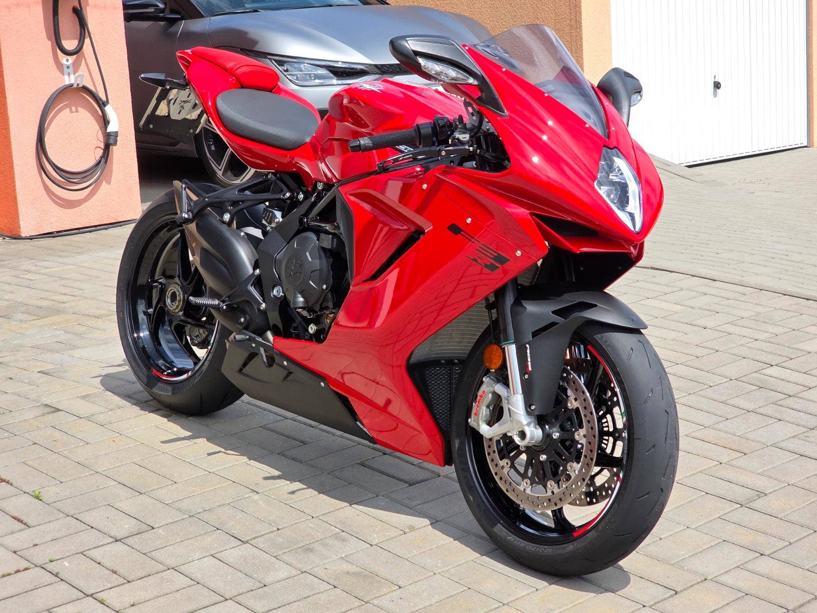 Prodám MV Agusta F3 R 800 v barvě Rosso, rok výroby 2024, najeto 5.100 km, výkon 108 kW (147koní), objem motoru 798cm3, STK platná do 8/2030. Motorka zakoupena jako nová u autorizovaného prodejce MV Agusta CARTec Motor Brno 12.4.2024. V plné tovární záruce do 4/2026. Poctivě zajetá poté provedený servis v 1000 km 23.5.2024, aktuálně po ročním servisu v 5068 km takže příští servis až 6/2026 nebo v 11.000 km. Proběhla výměna oleje, filtru, výměna brzdové kapaliny, čištění a mazání řetězu, nová zadní pneumatika Pirelli Diablo Roso IV Corsa. Na motorce navíc originální doplňky MV Agusta, páčka brzdy a spojky (9.500Kč), držák RZ s osvětlením (4.800Kč), racing tmavé plexi (3.500Kč), proužky na kola Reparto Corse (1.500Kč), nabíječka (3.750Kč). Celkově ve stavu nové motorky nehavarovaná, nelakovaná, připravená na ježdění. Nastavitelné jízdní režimy, tříválcový motor s opačně se otáčející klikovou hřídelí, 147koní, 174kg, Inerciální víceosá jednotka, náklonové ABS od Continentalu, kontrola trakce, tempomat nebo systém proti zvedání předního kola. Jako správný závodní stroj je vybaven i launch control tlačítkem a obousměrným rychlořazením třetí generace, plně nastavitelná přední 43 mm USD vidlice od Marzocchi, vzadu je centrálně umístěný nastavitelný tlumič Sachs, Brembo 4pístkové brzdiče, trubkový kompozitní rám propojen s jednostrannou kyvnou vidlicí, barevný TFT displej, který si můžete propojit s vaším telefonem (navigace, telefon, zprávy, hudba) apod. Původní cena motorky včetně doplňků byla 522.000Kč.