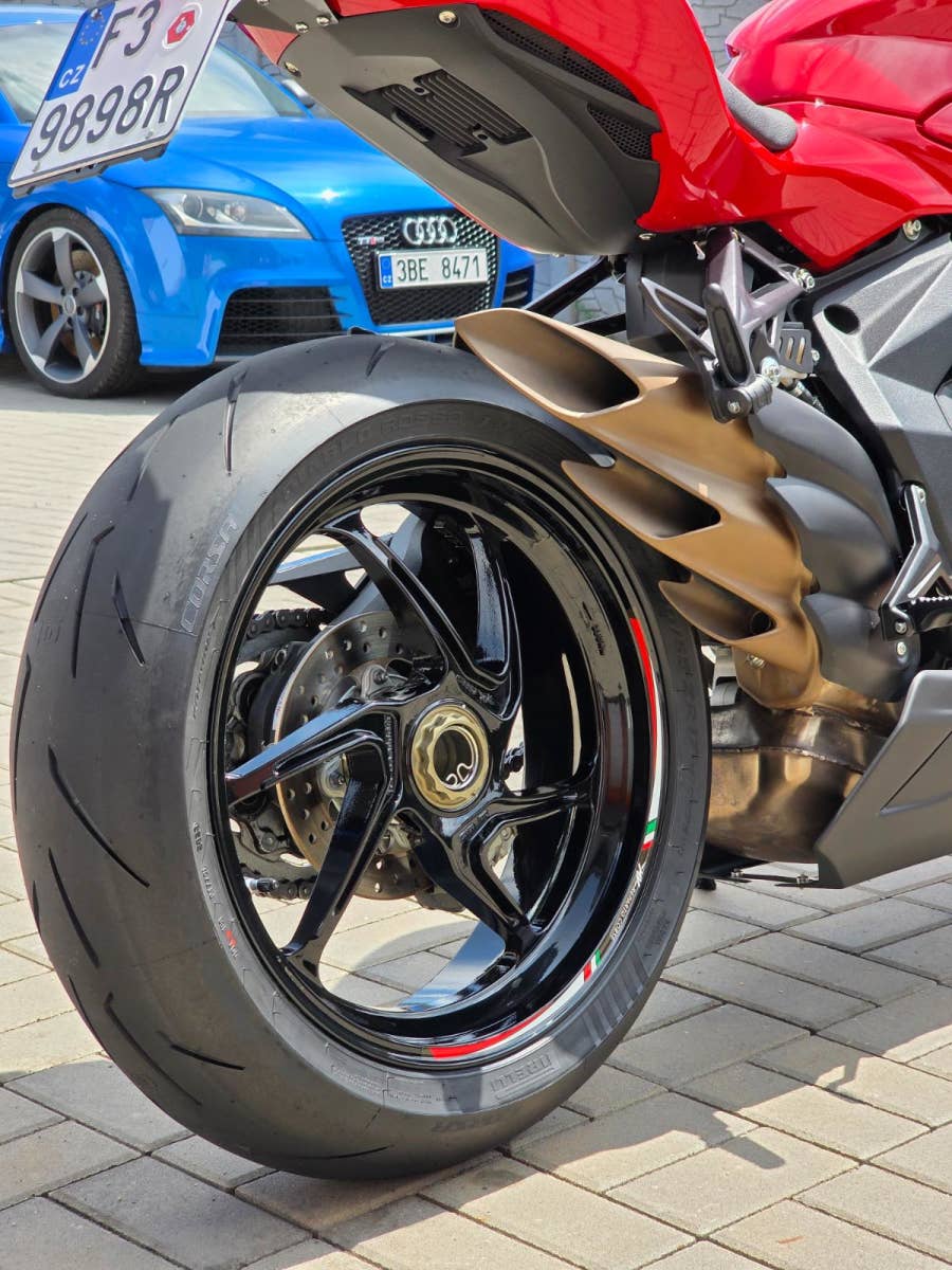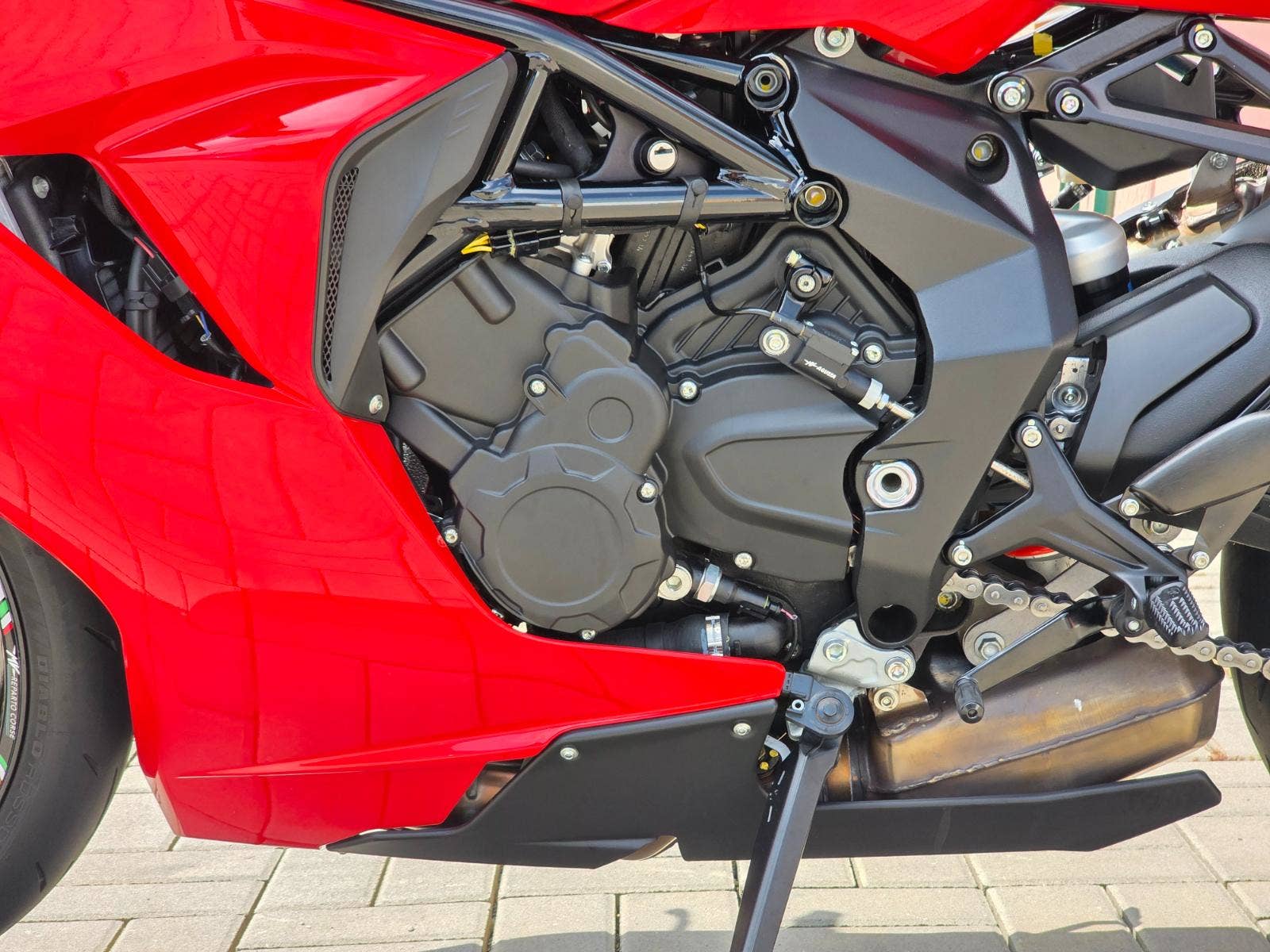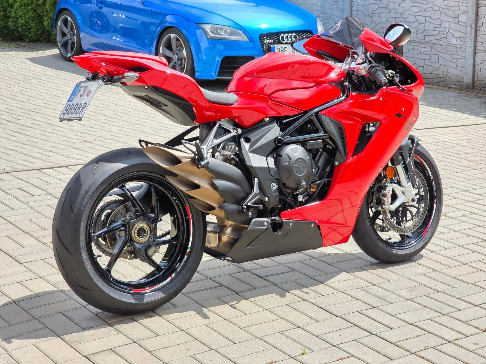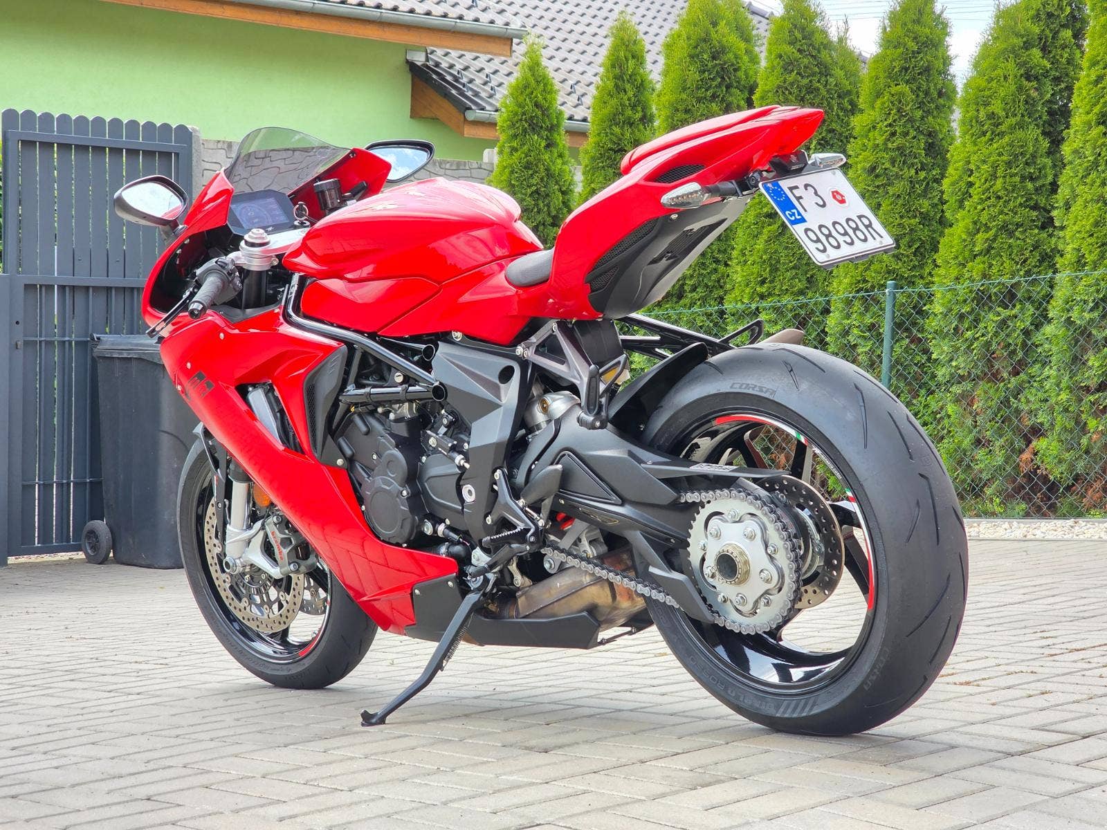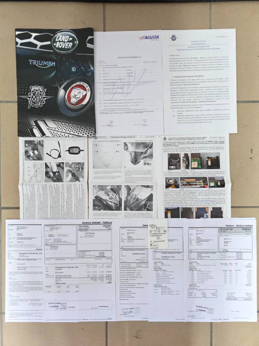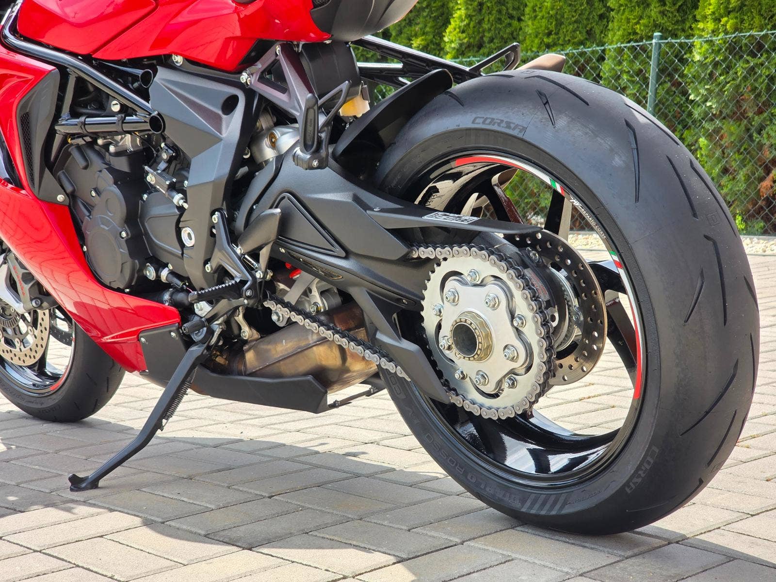 Prodám MV Agusta F3 R 800 v barvě Rosso, rok výroby 2024, najeto 5.100 km, výkon 108 kW (147koní), objem motoru 798cm3, STK platná do 8/2030. Motorka zakoupena jako nová u autorizovaného prodejce MV Agusta CARTec Motor Brno 12.4.2024. V plné tovární záruce do 4/2026. Poctivě zajetá poté provedený servis v 1000 km 23.5.2024, aktuálně po ročním servisu v 5068 km takže příští servis až 6/2026 nebo v 11.000 km. Proběhla výměna oleje, filtru, výměna brzdové kapaliny, čištění a mazání řetězu, nová zadní pneumatika Pirelli Diablo Roso IV Corsa. Na motorce navíc originální doplňky MV Agusta, páčka brzdy a spojky (9.500Kč), držák RZ s osvětlením (4.800Kč), racing tmavé plexi (3.500Kč), proužky na kola Reparto Corse (1.500Kč), nabíječka (3.750Kč). Celkově ve stavu nové motorky nehavarovaná, nelakovaná, připravená na ježdění. Nastavitelné jízdní režimy, tříválcový motor s opačně se otáčející klikovou hřídelí, 147koní, 174kg, Inerciální víceosá jednotka, náklonové ABS od Continentalu, kontrola trakce, tempomat nebo systém proti zvedání předního kola. Jako správný závodní stroj je vybaven i launch control tlačítkem a obousměrným rychlořazením třetí generace, plně nastavitelná přední 43 mm USD vidlice od Marzocchi, vzadu je centrálně umístěný nastavitelný tlumič Sachs, Brembo 4pístkové brzdiče, trubkový kompozitní rám propojen s jednostrannou kyvnou vidlicí, barevný TFT displej, který si můžete propojit s vaším telefonem (navigace, telefon, zprávy, hudba) apod. Původní cena motorky včetně doplňků byla 522.000Kč.
