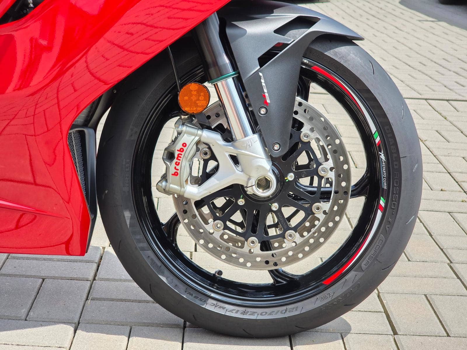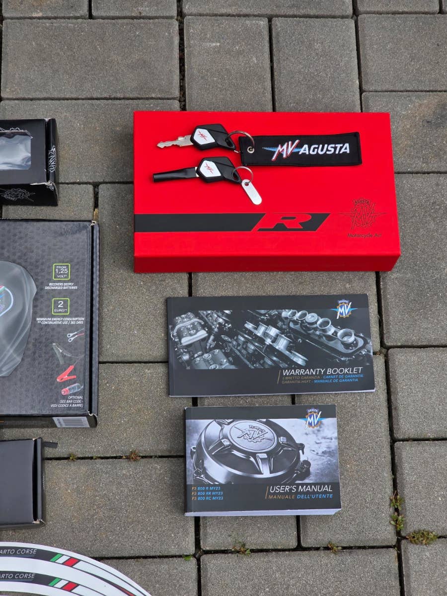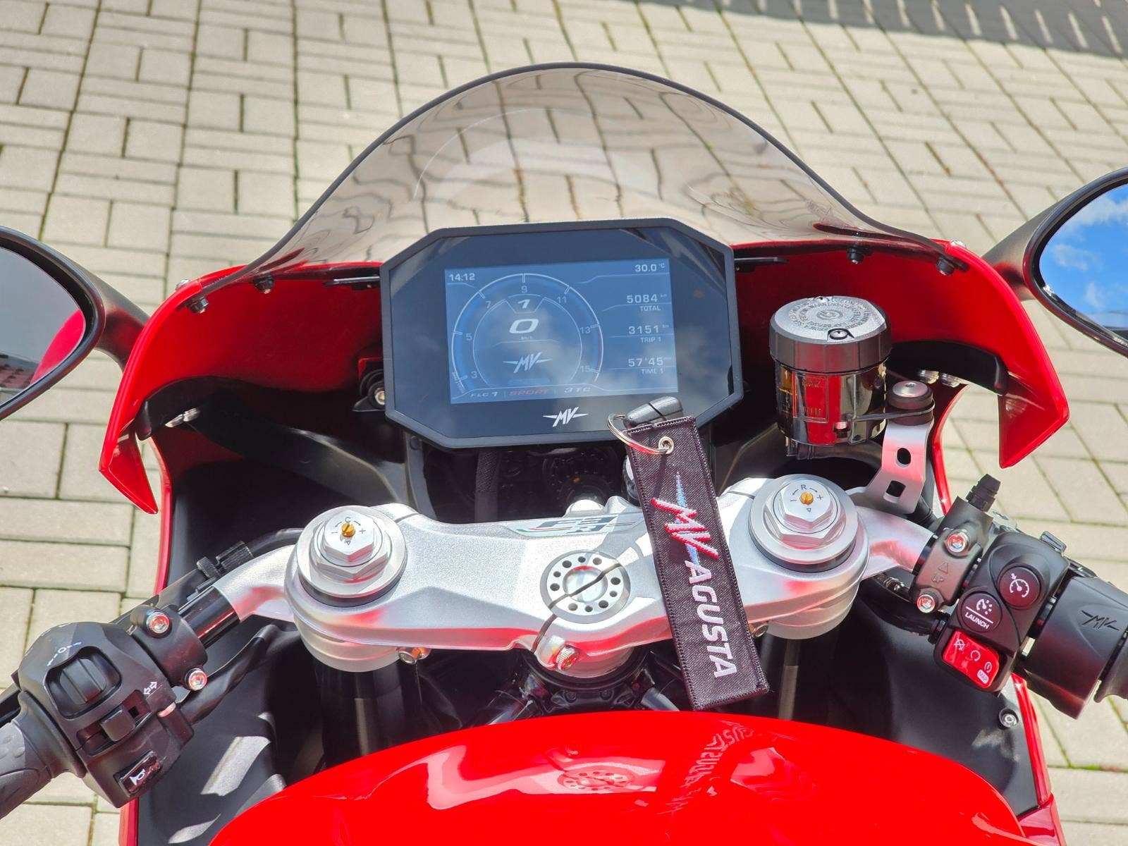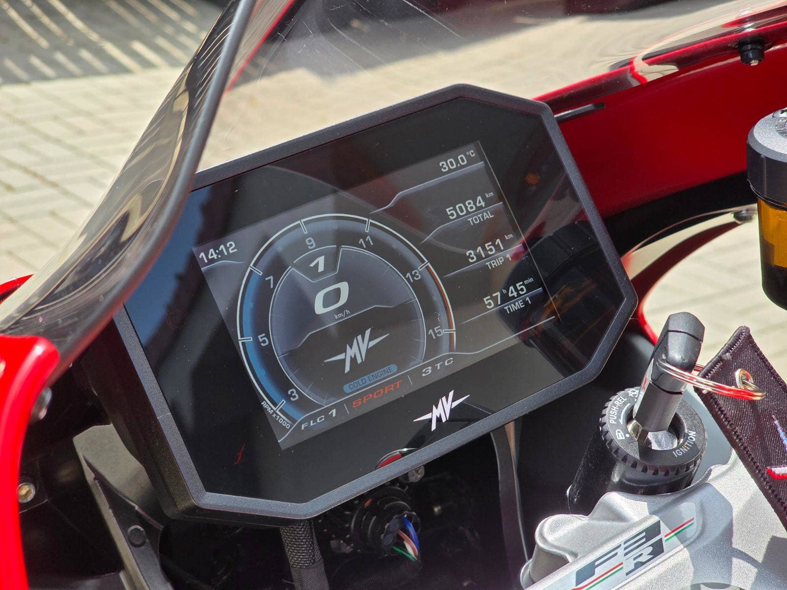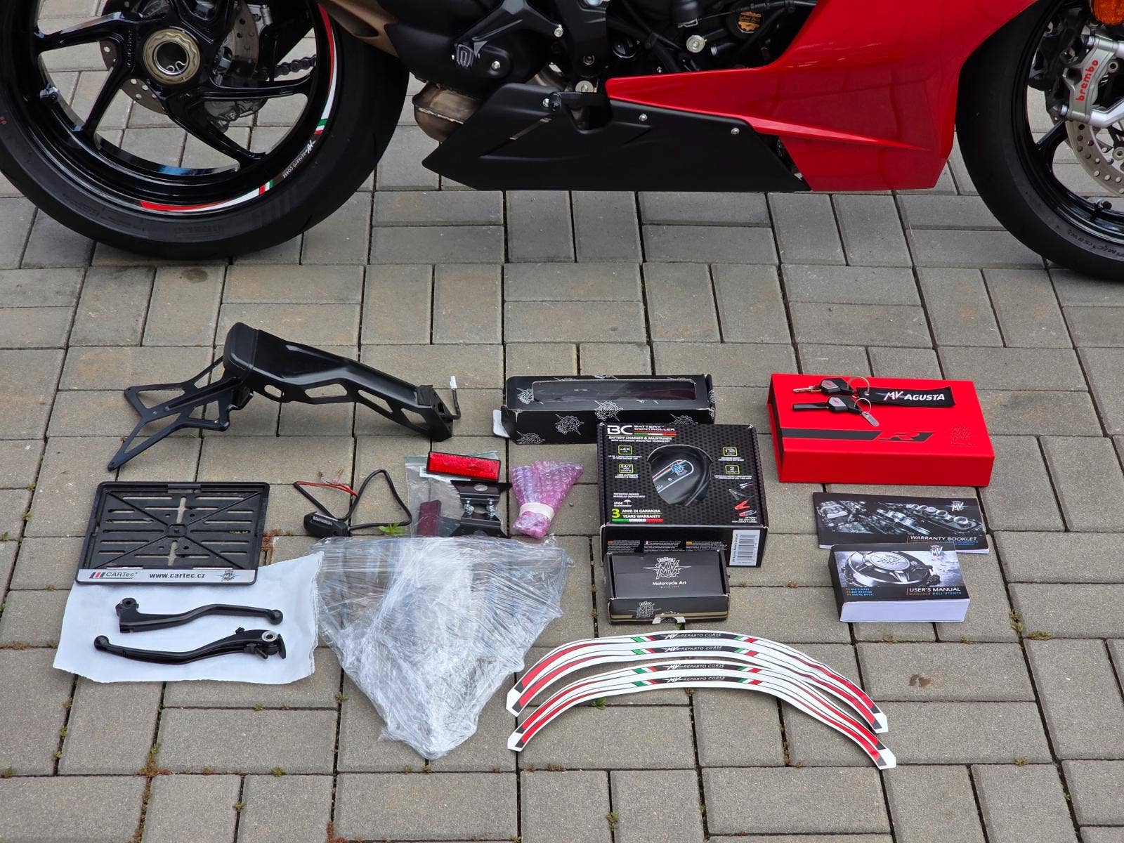Prodám MV Agusta F3 R 800 v barvě Rosso, rok výroby 2024, najeto 5.100 km, výkon 108 kW (147koní), objem motoru 798cm3, STK platná do 8/2030. Motorka zakoupena jako nová u autorizovaného prodejce MV Agusta CARTec Motor Brno 12.4.2024. V plné tovární záruce do 4/2026. Poctivě zajetá poté provedený servis v 1000 km 23.5.2024, aktuálně po ročním servisu v 5068 km takže příští servis až 6/2026 nebo v 11.000 km. Proběhla výměna oleje, filtru, výměna brzdové kapaliny, čištění a mazání řetězu, nová zadní pneumatika Pirelli Diablo Roso IV Corsa. Na motorce navíc originální doplňky MV Agusta, páčka brzdy a spojky (9.500Kč), držák RZ s osvětlením (4.800Kč), racing tmavé plexi (3.500Kč), proužky na kola Reparto Corse (1.500Kč), nabíječka (3.750Kč). Celkově ve stavu nové motorky nehavarovaná, nelakovaná, připravená na ježdění. Nastavitelné jízdní režimy, tříválcový motor s opačně se otáčející klikovou hřídelí, 147koní, 174kg, Inerciální víceosá jednotka, náklonové ABS od Continentalu, kontrola trakce, tempomat nebo systém proti zvedání předního kola. Jako správný závodní stroj je vybaven i launch control tlačítkem a obousměrným rychlořazením třetí generace, plně nastavitelná přední 43 mm USD vidlice od Marzocchi, vzadu je centrálně umístěný nastavitelný tlumič Sachs, Brembo 4pístkové brzdiče, trubkový kompozitní rám propojen s jednostrannou kyvnou vidlicí, barevný TFT displej, který si můžete propojit s vaším telefonem (navigace, telefon, zprávy, hudba) apod. Původní cena motorky včetně doplňků byla 522.000Kč.