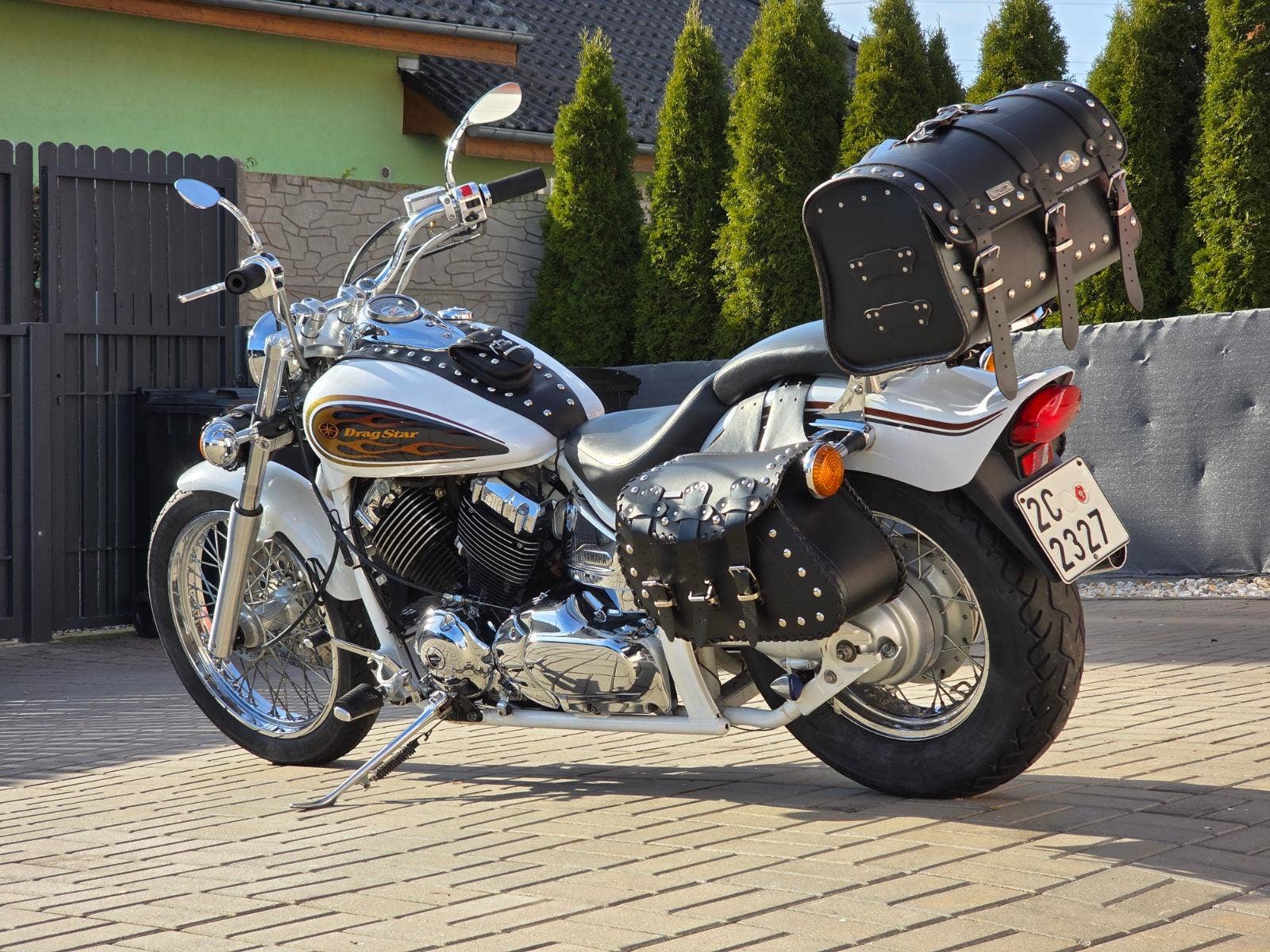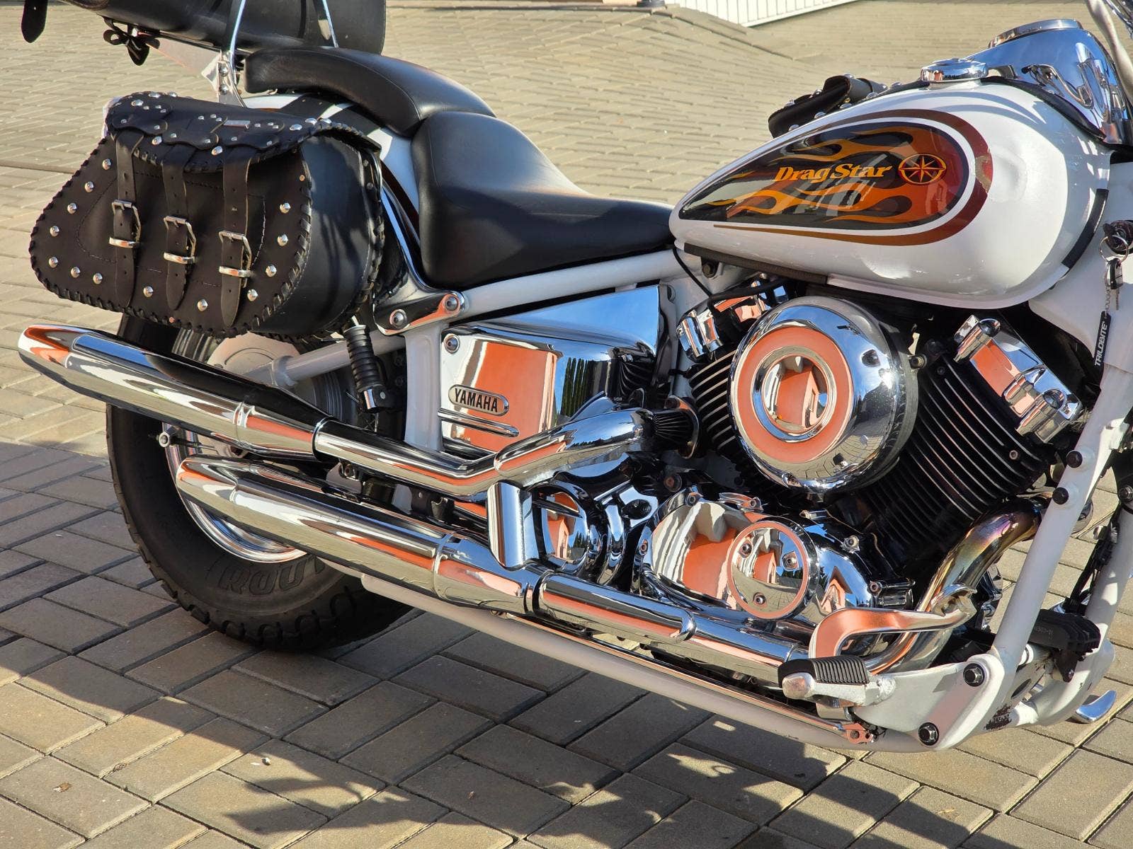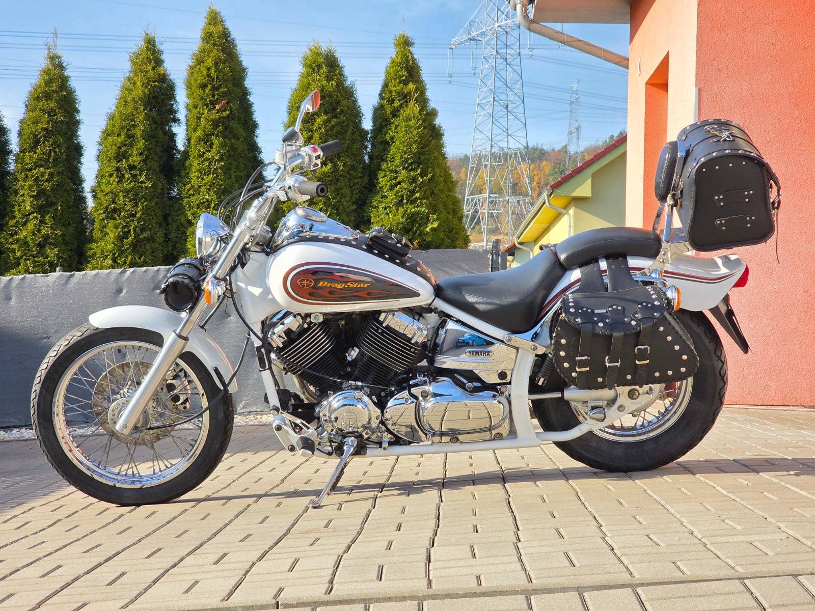 Prodám Yamaha XVS 650 Dragstar v zajímavé originální barevné kombinaci bílá s bílým rámem, rok výroby 2000, najeto 41.700 km, výkon 29 kW, objem motoru 649cm3, STK platná do 5/2027. Motorka byla dovezena do ČR již v roce 2007 s nájezdem 18.000 km. Pravidelně servisovaná. Na motorce jsou navíc doplňky jako opěrka spolujezdce plus zadní nosič (7.000Kč), nosiče na brašny (2.000Kč), boční brašny RSA (5.000Kč), zadní brašna zamykatelná RSA (5.000Kč), kožená pás na nádrž (2.000Kč), rolka (1.000Kč), teploměr, hodiny. Pěkná udržovaná motorka v originálních barvách s originál výfuky.